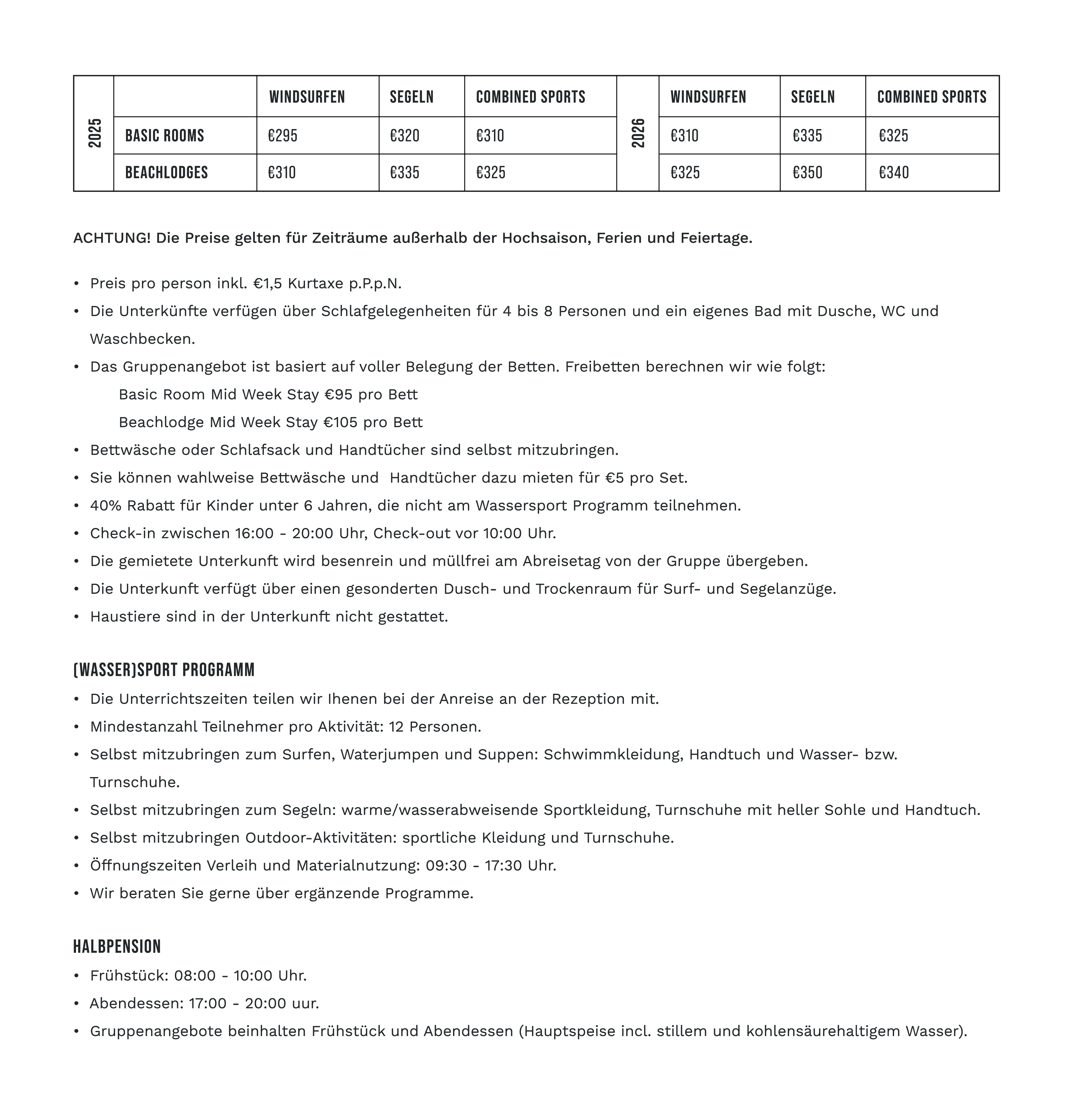 Ein komplettes Arrangement von Montag bis einschließlich Freitag für Gruppen ab 12 Personen. Inklusive Unterkunft in den Beachlodges oder den Basic Rooms mit Halbpension und 3-tägigem Wassersportprogramm nach Wahl.